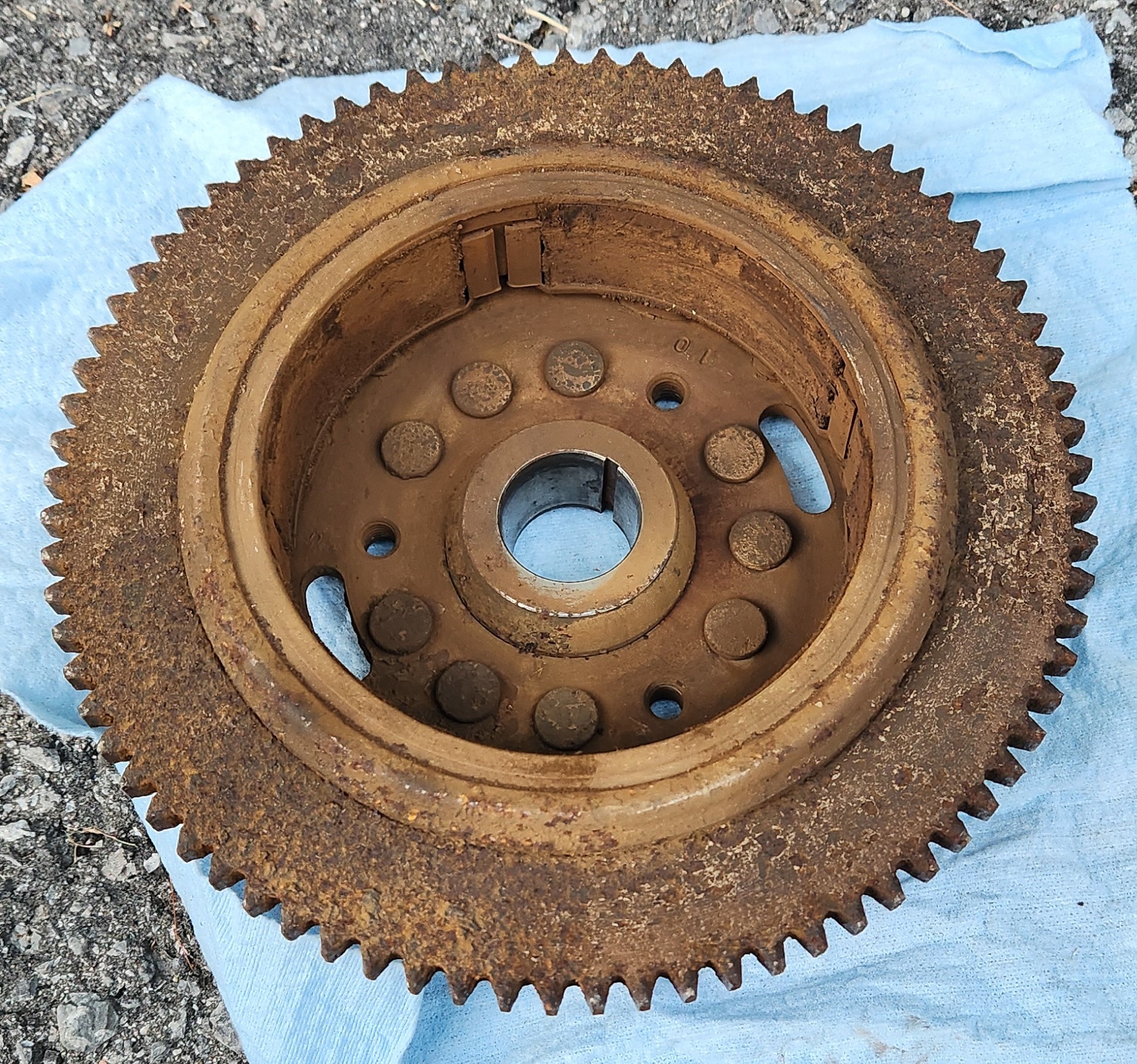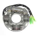 The upper coil in the stator supplies power and spark timing to the ignition module. There are magnets embedded in the flywheel. The ignition module fires both plugs at the same time.